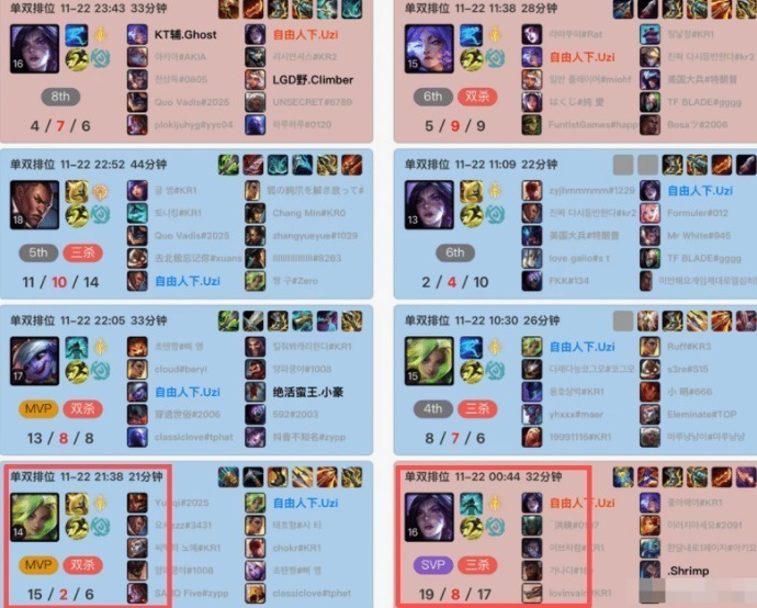 外界的怀疑并非空穴来风,Uzi近期在韩服的高强度排位,更像是一种信号:仅一天之内连打十七局,而且英雄选择高度贴合职业赛场——泽丽、卡莎、卢锡安、金克丝等版本下路核心英雄均榜上有名,战绩甚至达到了“顶级AD选手水准”,对于一位已退役并休息已久的选手来说,这样的强度显然不像是“玩得上头”,更像是职业节奏的回归。