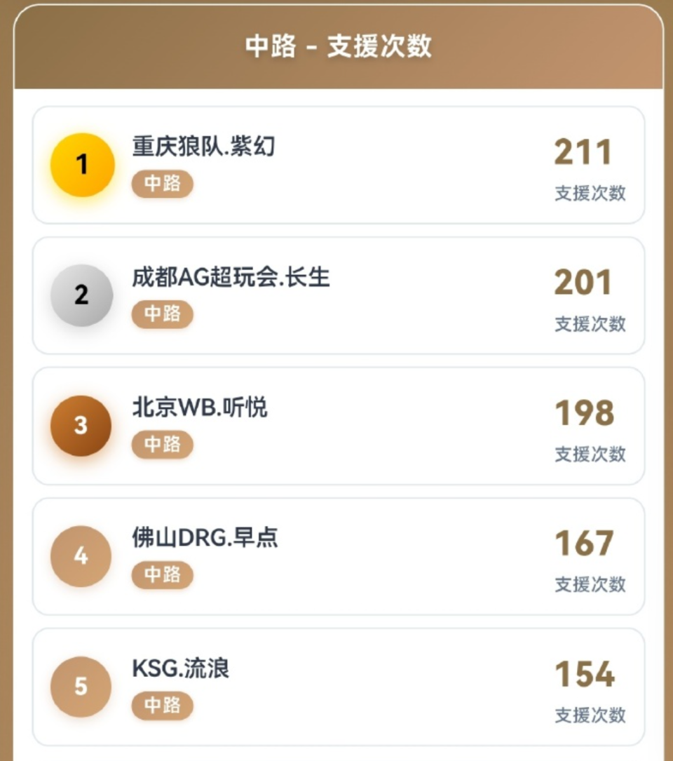 “支援次数”这个指标背后,隐藏着一个更前置的核心能力:线权,通过中路的“枢纽”位置以最短路径配合队伍战术执行,一个频繁、高效支援的中单,能极大提升整个团队的上限。目前排名第一是狼队的紫幻!