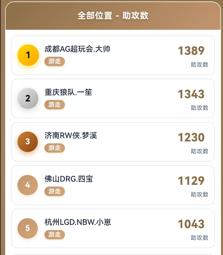 高“助攻数”,代表着高效参与关键战斗的次数高,意味着每一次的团战支援都能切实帮助团队创造了优势,也意味着高效的团队决策成功率。排名第一是AG大帅!