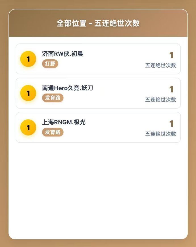 最后一个是五连绝世次数,这就很好理解了,就是拿到五杀的选手,目前有三个选手都拿到过五杀,谁能拿这个奖,就看挑杯是否能有所突破了!