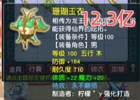 答案揭晓:一件100级男衣,初防高达184,体质+22,魔力+20,还带“永不磨损”特效!这件法系顶级神装,最终以12.3亿梦幻币的天价成交!
