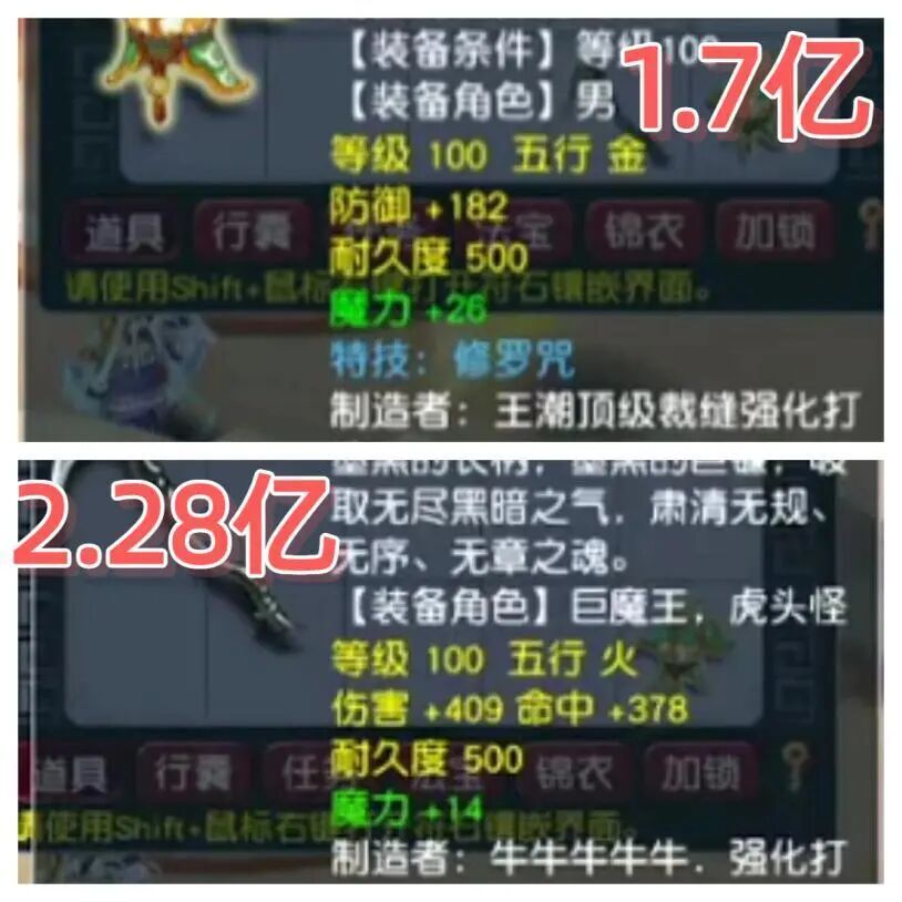 100级的初防+182,魔力+26,特技是修罗咒的100级男衣是1.7亿成交的。100级的伤害+409,命中+378,魔力+14的斧子是2.28亿成交!