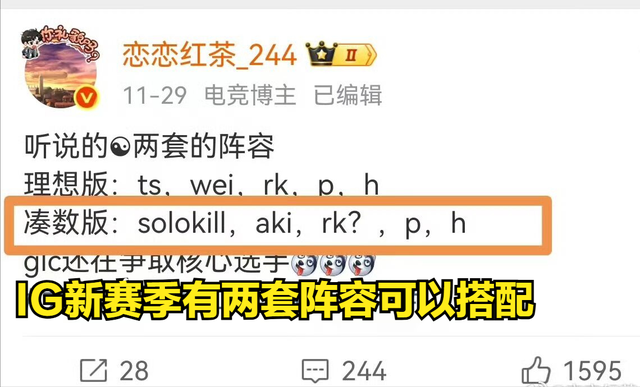恋恋红茶透露,只要TheShy愿意续约,那么IG打野WEI就愿意继续留在IG。但是TheShy如果不续约IG,那么IG打野WEI将会选择第一赛段休息,然后ROOKIE前队友打野AKI、AD选手萧P和辅助Hang会加盟IG,然后让上单Solokill代替TheShy来打比赛。(不得不说,IG这个“凑数版”的阵容,只要能进季后赛就算成功,真的一眼看到尽头)