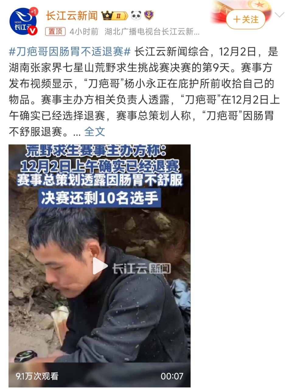 12月2日,备受关注的张家界七星山荒野求生传来“噩耗”,人气选手“刀疤哥”宣布退赛,让众多网友感到惋惜。