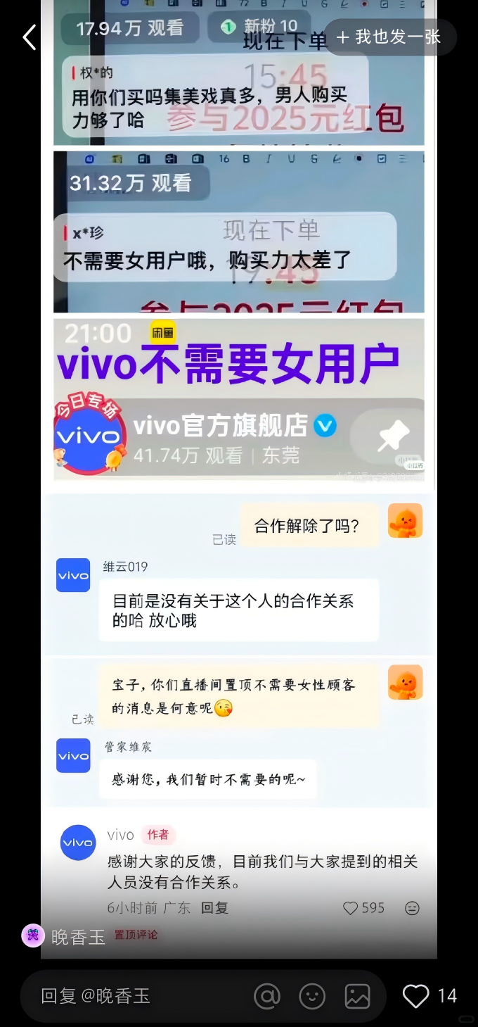作为手机品牌的vivo,仅仅因为遥散人之前做过一次发布会观看,也被卷入了这场愤怒。官方社交账号,遭到了大量冲击。攻击者用切片视频、直播等方式,虚构“vivo不需要女用户”的言论,逼迫vivo官方发布与逍遥散人切割的声明。