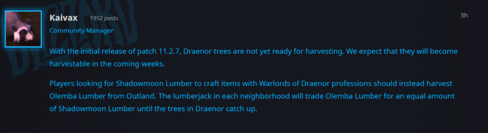 若玩家需要影月木材来进行《德拉诺之王》版本专业技能的物品制作,可转而从外域采伐奥莱姆巴木材。在德拉诺树木开放采伐前,各家园社区内的伐木工都将以 1:1 的比例,用奥莱姆巴木材兑换影月木材。