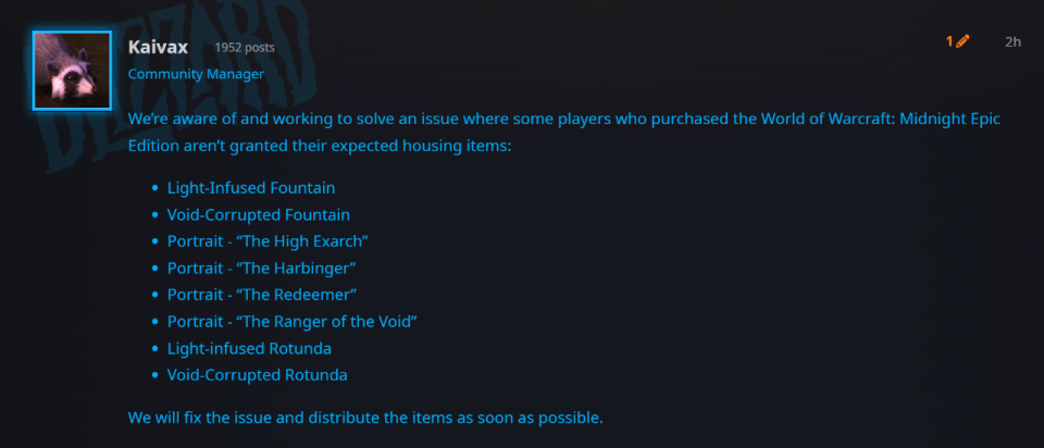 你以为这就完了吗?美服很多预购史诗版的玩家上线后,第一时间冲向家宅系统,想领取自己史诗版本的家宅奖励然后就有部分玩家发现,自己明明预购了史诗版,还是没有奖励啊,大量的帖子开始被发布,于是过了一小会,暴雪又追加了一个蓝贴:我们已经注意到并正在努力解决部分购买了《魔兽世界:至暗之夜史诗版》的玩家未能获得预期房屋物品的问题:只能说最近新版本真的太离谱了,像前面蓝贴里的死寂无讯都是11.2.0新增的任务了,现在居然还能出BUG,魔兽的底层代码真的是太奇怪了!