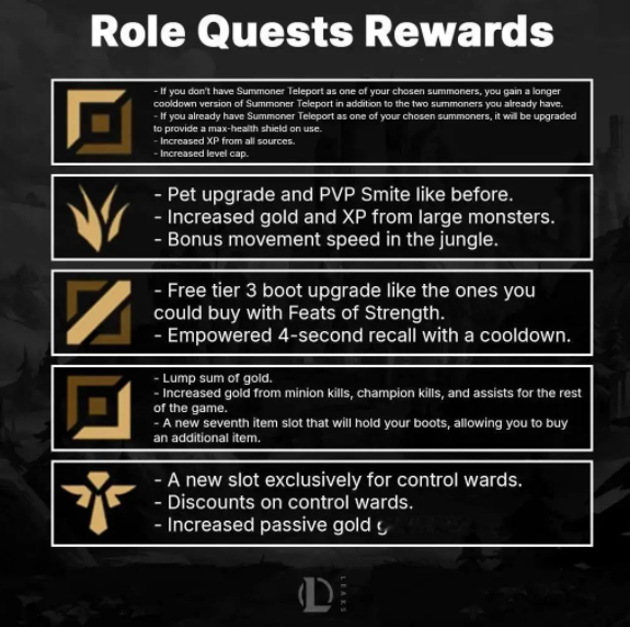 例如:上路奖励:提高等级上限+强化TP,上路玩家多年吐槽的“边缘化”终于得到回应,强化传送将进一步提升上路在中后期的带节奏能力。下路奖励:金币增加+解锁第七装备栏,鞋子不占格子