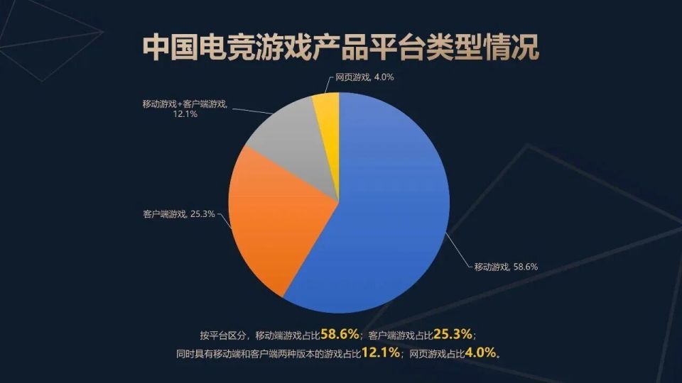 《报告》显示,电子竞技游戏平台占比情况中,移动游戏占比58.6%;客户端游戏占比25.3%;同时具有移动和客户端两种版本的电竞游戏占比12.1%;网页游戏占比4.0%。