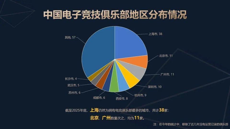 《报告》显示,2025年,中国电子竞技产业实际收入为293.31亿元,同比增长6.40%。用户规模超4.95亿人,较去年增长明显,增长率为1.06%。中国电子竞技俱乐部共有165家,拥有10家及以上电子竞技俱乐部的城市包括上海、北京、广州和深圳。其中,上海依然是拥有俱乐部数量最多的城市,继续排在首位。