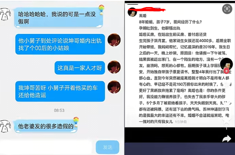第二,精神层面缺乏对丈夫的关怀。坤哥每月给妻子三万生活费,这在普通家庭绝不是小数目。妻子平日清闲,哪怕多说几句暖心话、发条关心的信息,坤哥恐怕也就知足了。但压垮他的最后一根稻草,发生在今年五到七月——那时游戏直播很难做,几乎赚不到钱,坤哥尝试做吃播、讲NBA、陪大龙猫户外直播,奔波多个项目,身心俱疲。一次因高强度工作没吃饭,他人生第一次低血糖发作,眼前一黑。当他告诉妻子时,只得到妻子两行冰冷的回复:一行嘲讽他“居然也会低血糖”,另一行是妻子翻起的旧账。那一刻,这个山东汉子再也忍不下去了——他能吃生活的苦,能扛工作的累,却无法接受在最需要安慰时,连一句体己话都得不到。