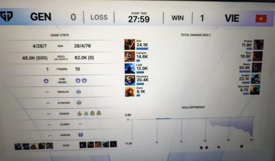 最终越南队打出了极其离谱的28-4人头比,比赛的夸张程度甚至让很多观众认为GEN是不是在场外吃米了,因为今年成绩不好,在场外好好回一波血。