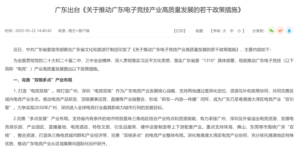 今年5月,省里就出台了《关于推动广东电子竞技产业高质量发展的若干政策措施》,从政策层面给电竞产业“开绿灯”。