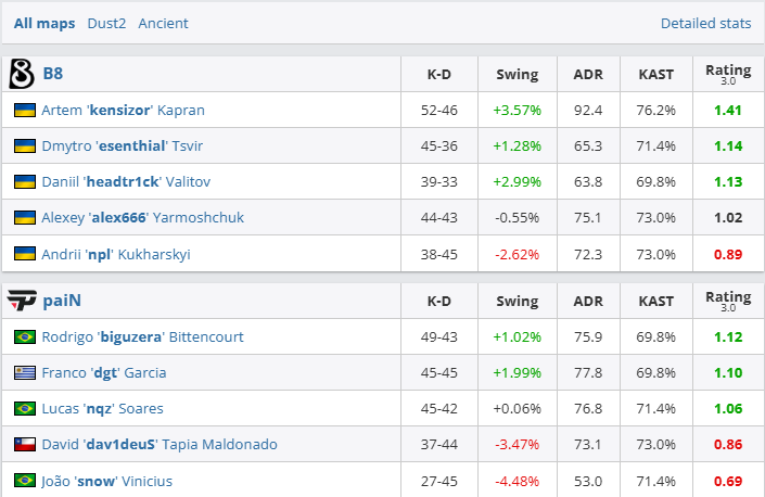 图一Dust2,巴西队拿到手枪局立马被B8翻盘,不过随后的巴西人连下9局一度10-5领先。尽管nqz大狙单局5杀,但凭借kensizor和esenthial两人联手,B8展开绝地追击进入加时。双方鏖战两个加时,kensizor单图砍下28杀帮助B8先下一城。