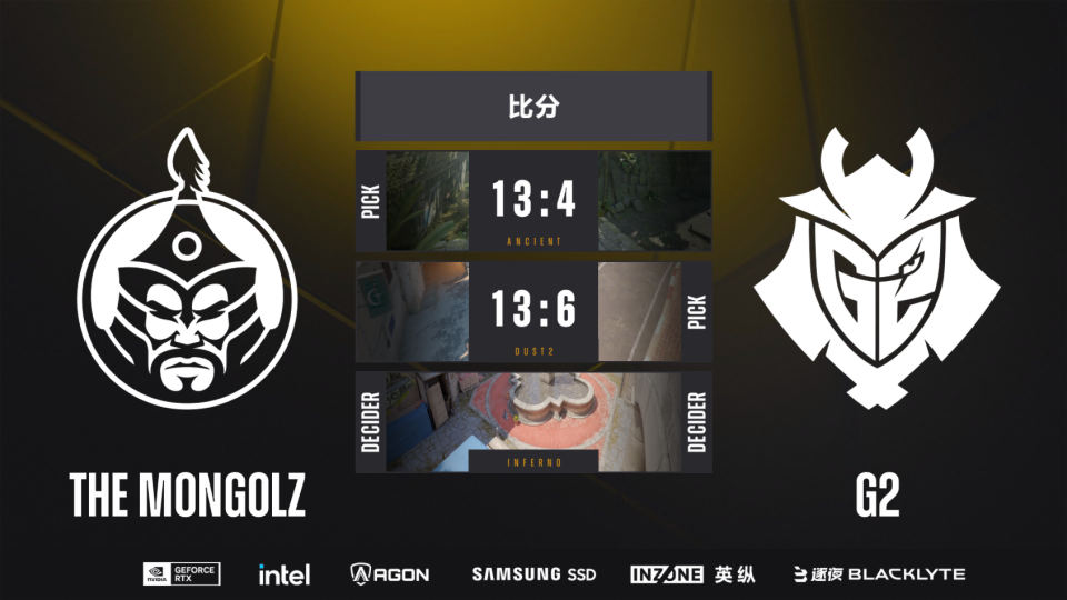 图二Dust2,0-2开局的蒙古队打出一波6-1防守,半场领先两分。换边蒙古队屡屡杀穿G2的A区,长枪局大汗从B洞到B点单局4杀撕碎对手防线。终局大汗再颗秒太阳神,蒙古人一波6-1攻势轻松晋级。
