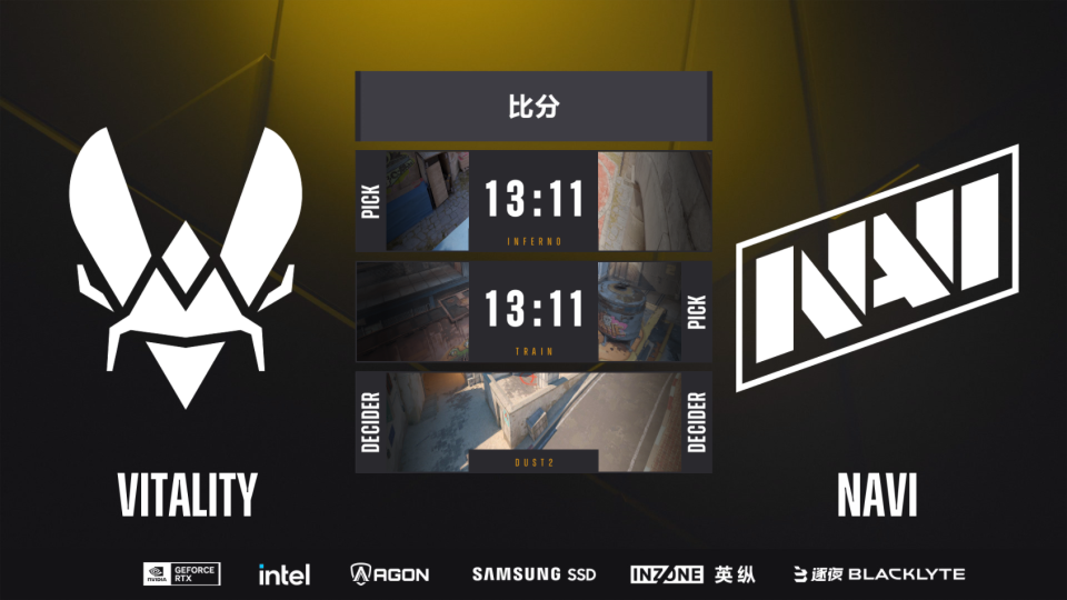 图二Train大黄蜂防守4-0开局,随后在w0nderful和iM的轮番发力下,NAVI接连追至4平、5平、6平。换边大黄蜂再拿手枪局9-6领先,依靠iM在高坡完成1V3(包括手雷炸死薯薯),双方又战至9平。但关键局w0nderful高台被秒,大黄蜂以人数优势拿下外场。而后NAVI虽然顽强追至11-12,但最终还是Vitality笑到最后。