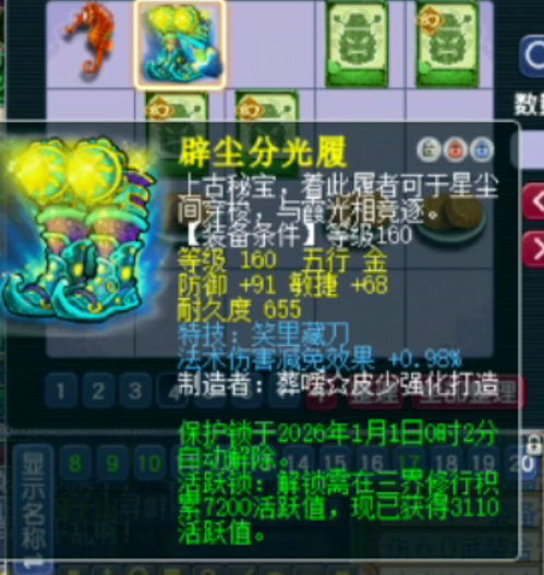 最近,一位老板在鉴定160级装备时,幸运地炸出一双笑里藏刀搭配法术减免0.98%的鞋子。这双鞋子不仅基础敏捷接近极限,还附带法术伤害减免效果,能为一速法系变相增加法术防御。再加上笑里藏刀这一PK核心特技,可以有效打乱对手的特技节奏,战略价值显著。
