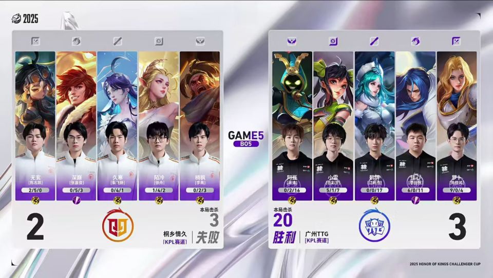 双方进入决胜局,2分20秒,情久三人集火击杀太乙真人,艾琳拿到一血。6分钟,TTG入侵红区,夏洛特闪现收掉裴擒虎,随后持续追击再次击杀三人。9分20秒,情久保持阵型,裴擒虎后手入场压低状态,最终情久一换二暂缓局势。10分30秒,裴擒虎抢到暗影暴君,但孙尚香极限反杀裴擒虎,最终TTG团灭对手推掉中路高地。14分10秒,TTG控下暗影暴君,随后依靠巨额经济差团灭对手,夏洛特三连决胜,TTG推掉水晶拿到胜利。