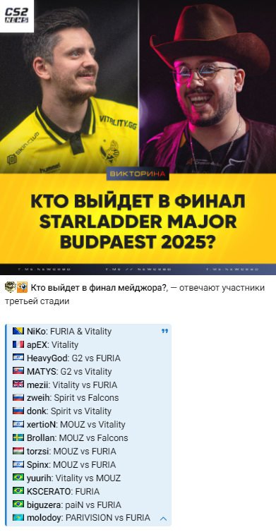 在StarLadder布达佩斯Major赛事期间,俄媒CS2NEWS邀请多位参赛选手进行趣味问答。对于“谁将晋级Major决赛?”这一问题,选手们的预测如下: