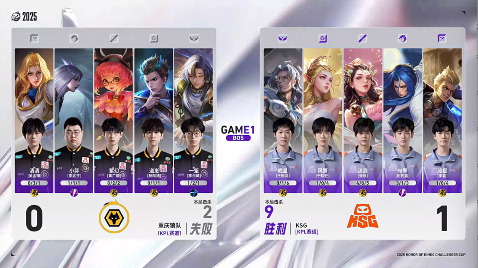 这场狼队用了清清和小胖首发,第一局前期清清就被抓了一波。这波感觉紫幻是知道有人要来的,但清清回撤的时候已经来不及了,KSG四人包夹,句号拿到了一血。安琪拉和夏洛特打了狂铁一套,也没打掉多少血。小胖还换位进去想强杀狂铁,谁给你的勇气,太阳吗?晚星牺牲了自己,但队友全部支援到位,清清先被击杀,小胖来回换位但还是被流浪击杀。句号一人拦住了道崽和紫幻,两人全走不掉了。最后剩下丝血的一笙,被流浪1A秒了。KSG直接打出一波五人团灭。KSG优势情况下一点都不浪,狼队也完全没有反击的意思,我就不打架,你要水晶我就给你,突出一个大气。