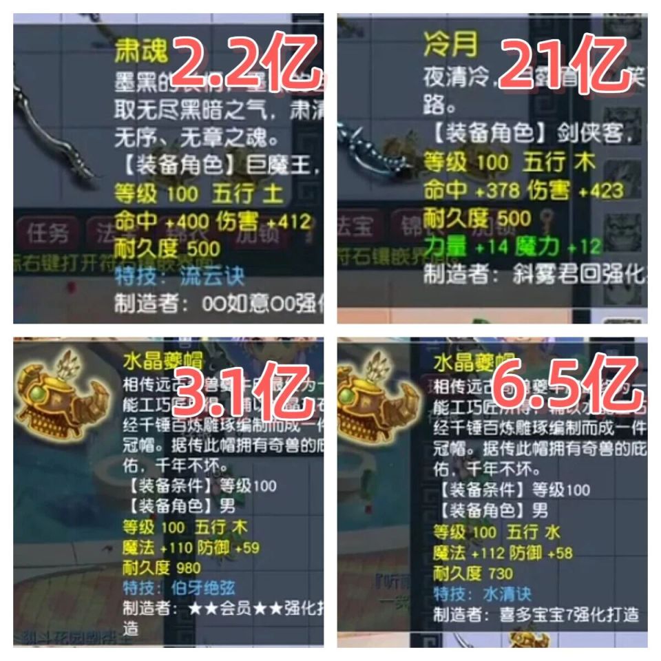 100级的伤害412命中400流云诀的斧子拍卖价格2.2亿,100级伤害+423力魔双加的刀价格是21亿,100级伯牙绝弦的男头价格3.1亿,100级水清诀的男头拍卖的价格是6.5亿!