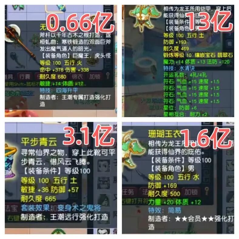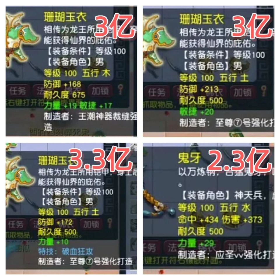 100级的力敏双加的男衣拍卖到了3亿,100级的213初防的敏捷+20的男衣拍卖价格是3亿,100级的加10点力量破血狂攻的男衣拍卖价格是3.3亿,100级的伤害+373命中+434力量+29的锤子拍卖的价格2.3亿!