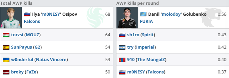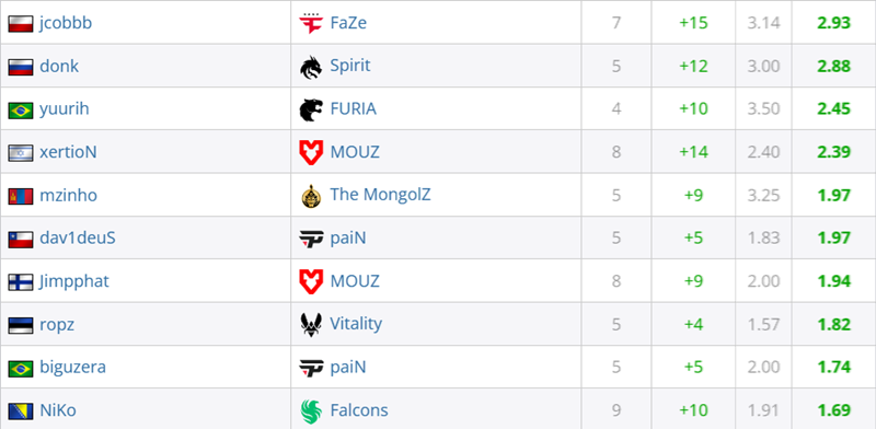 第一名依旧是状态出众的donk,他以平均每回合0.66的高爆头率成功霸榜,比第二名kyousuke高出了0.11。来自Passion UA的Kvem位列第三。
