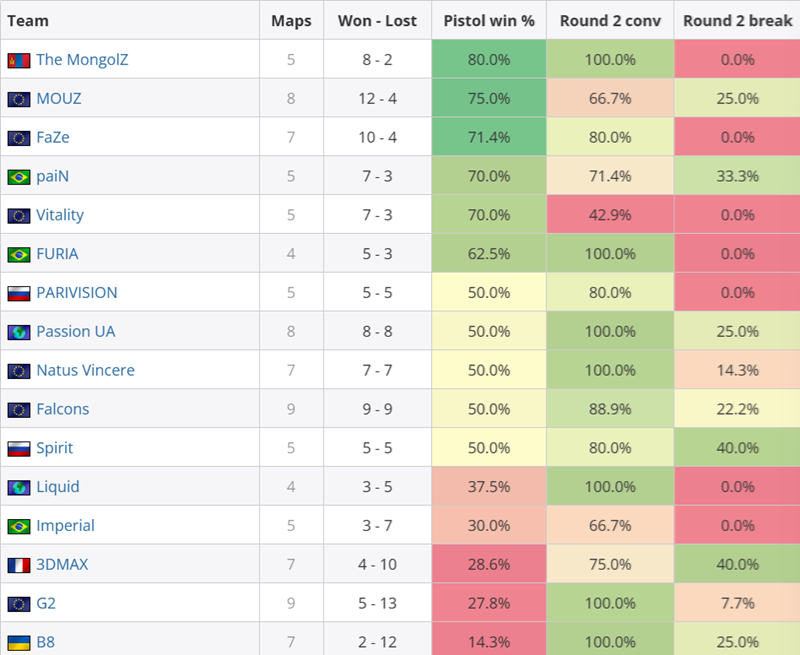 在本次第三阶段中,The MongolZ是手枪局胜率最高的队伍,达到了惊人的80%。而Falcons的手枪局问题明显,和Spirit、Natus Vincere一样,均为50%。这会成为他们的淘汰赛隐忧。