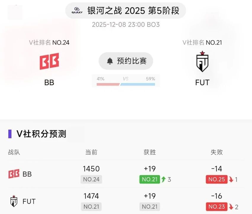 银河之战2025 阶段五已经进行到了半决赛阶段,BB与FUT要争夺一个晋级总决赛的名额。两支队伍也是因为积分不足无法晋级Major而提前迈向了2026年。这次比赛如果BB获胜将会让他们前进三名。而FUT获胜无法加排名,失败会降低排名。交手记录上看,两队均有胜负,不过在BO3赛制下上次BB以2-1战胜了FUT。图池胜率上看,BB的样本更多,而FUT虽然胜率高但样本少。综合对比下来BB本场胜算更高,而FUT如果能延续爆发力,也有机会战胜对手。