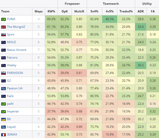 FURIA在4v5对局中有着恐怖的48.3%胜率,这项数据足以表明当前FURIA战队团队协作以及选手个人能力均处于世界最强水平。