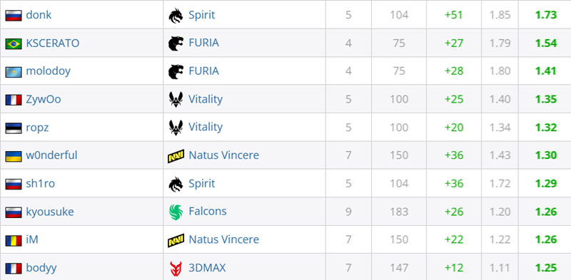 Spirit战队明星选手donk以1.73的rating碾压众人位居榜首。队伍能以3-0连胜的成绩率先晋级,donk在其中功不可没。第二名KSCERATO尽管也发挥不俗,但rating和donk相差了将近0.2。