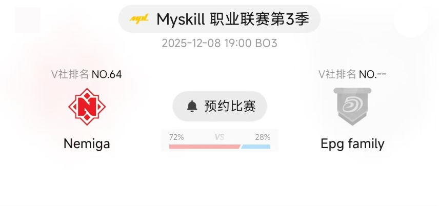 独联体二线赛事常驻队伍Nemiga在未能晋级本届Major后,将眼光放到了2026年。近期他们参加的赛事主要目的还是为了赚取足够的VRS积分提升排名,争取在明年获得更多的赛事邀请。今日的两场比赛,他们的对手排名以及硬实力上都有明显的差距,Epg family暂无排名,FORZE Reload位列第98名,并且Nemiga曾以2-0击败过FORZE Reload。从强度上看,Nemiga的两个对手属于欧洲底层实力,Nemiga拿下这两场比赛应该会非常轻松。
