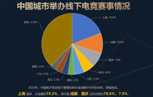 值得注意的是,2025年中国省级及以上有职业选手参与的非表演类电竞赛事共计举办142项,较去年增加了18项。其中,54%的赛事采用全程线下模式,37%的赛事采用线上线下结合模式,9%的赛事为纯线上模式。此外,2025年中国电子竞技线下赛事的举办城市集中分布在华东、西南地区。上海、成都和重庆位列线下赛事举办数量前三。其中,19.2%的线下电竞赛事在上海举办,成都、重庆的举办数量分别占比为10.6%和7.9%。