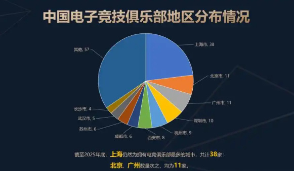 《报告》显示,截至2025年底,中国电子竞技俱乐部共有165家,拥有10家及以上电子竞技俱乐部的城市包括上海、北京、广州和深圳。其中,上海依然是拥有俱乐部数量最多的城市,继续排在首位。参赛情况方面,54.3%的电竞俱乐部仅参与单一类型赛事,22.8%的俱乐部参加2种赛事。参与3种类型赛事的占比6.3%,参与4种类型赛事的占比7.1%。