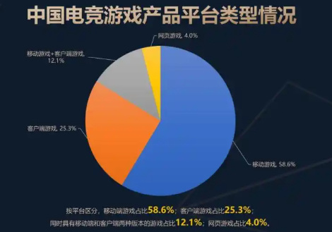 《报告》显示,中国电子竞技游戏主要产品的玩法类型中,射击类产品占比最高,为28.3%。多人在线战术竞技类(MOBA)和体育类次之,占比均为14.1%。按平台分类,移动游戏占比58.6%,客户端游戏占比25.3%,同时具有两种版本的电竞游戏占比12.1%,网页游戏占比4.0%。