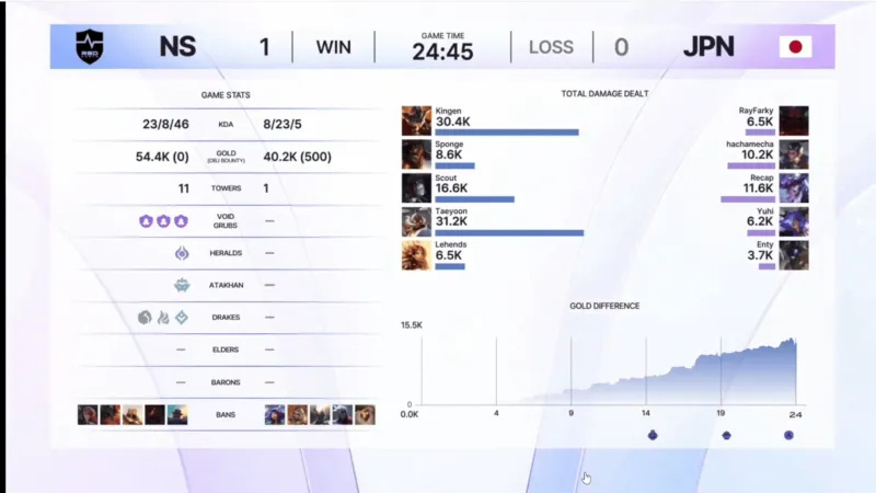 结果这一局比赛,双方各打了半场好局,T1利用经验笑到了最后。比赛前期NS打出优势,比赛第10分钟NS小龙团打出0换2后一度7-2开局;比赛第20分钟左右,两队在河道爆发混战,T1抓到机会打出1换4大胜逆转前期劣势;比赛第23分钟左右,T1野区打出2换4后拉开经济差;最终比赛第27分26秒,Oner潘森砍下三杀,T1一波团灭NS结束比赛。