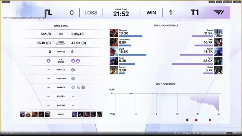 第五局比赛,TL蓝色方,禁用:妮蔻、沙皇、岩雀、卢锡安、波比,选用:Morgan兰博、Josedeodo剑魔、Quid永恩、Yeon卡莎、CoreJJ芮尔;T1红色方,禁用:芸阿娜、发条、阿萝拉、蛇女、牛头,选用:Doran加里奥、Oner赵信、Faker瑞兹、Peyz卡莉斯塔、Keria烈娜塔