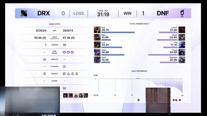 在刚结束的Kespa杯小组赛的比赛中,DNF击败DRX拿到小组赛第二胜。目前两队同为2胜2负。