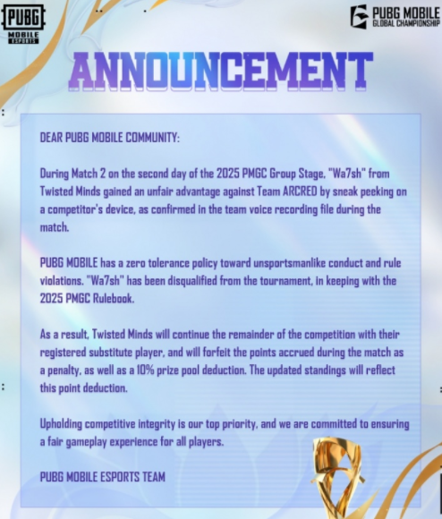 PUBGM官方公告的措辞并不含糊:选手“Wa7sh”通过观察对手设备信息以获取不公平优势,其行为违反2025 PMGC赛事规则,因此立即执行禁赛,并由替补补位,同时,战队不仅无法保留此前累计积分,还将被扣除10%的奖金份额,这种“连坐式处罚”看似严厉,却传达出一个极为明确的信号——公平竞争高于一切。