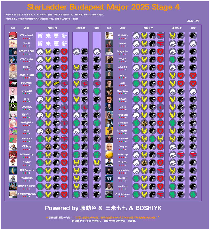 同时一起来看看国内外主播、分析师以及选手们对布达佩斯Major淘汰赛的竞猜作业。