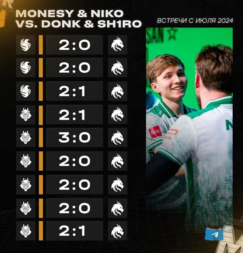 历史数据显示,自2024年7月以来,由NiKo与m0NESY组成的双子星,简直就是donk与sh1ro的“严父”。无论是在G2时期还是如今身披Falcons战袍,这对“尼孩”组合在面对Spirit时展现了令人窒息的统治力。