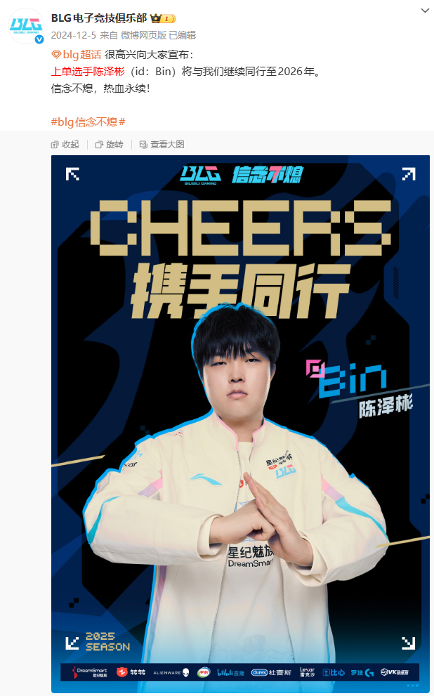BLG在转会期的操作夯爆了,续约了左手,还签下了Viper。有爆料称Bin哥主动降薪,为了组建更好的阵容。北川的经纪人在粉丝聊天群爆料:Bin为了BLG能补强阵容,降了不少薪水,明年的薪水是1000万。爆料信息仅供参考,不一定正确。这位Beichuan经纪人有一个“失败爆料”案例,就是在世界赛瑞士轮期间说TES经理郭皓离职了,但其实郭皓一直在TES好好工作着。上午造谣郭皓离职了,下午TES就把BLG淘汰了。还有一个疑点,Bin是在24年年底和BLG续约了两年,本来25年和26年Bin就会在BLG打,薪水已经定了。难道Bin还和BLG重签一份合同?要的薪水更低?举个例子,你和公司签的合同是月薪5000,你干了一个月后说重新签一份合同吧,只要3000就行。不过这也不是完全不可能,因为Bin自降薪水,BLG就有更多预算在转会期进行操作,组出更好的阵容。正因为给Bin花的钱少了,BLG才能续约Knight和签下Viper。如果真的是这样,那只能说“Bin哥伟大,无需多言”了。还有一种可能性是,BLG今年仅取得16强的成绩,非常不理想。Bin作为BLG的队魂和太子,他非常愧疚,觉得自己不配拿高薪,于是主动降薪,既相当于承担责任,又能让队伍补强阵容,明年雪耻。像Bin这样的顶级选手,赚的钱已经够多了,部分职业选手可能真没有那么看重钱,更在乎世界赛冠军。之前Elk在BLG,其实薪水也不高。Bin和BLG的合同明年结束,如果BLG没能留住Knight,明年Bin带队BLG,没有取得好成绩,那Bin的下一份合同不就坏了吗?但是现在有了左手和Viper,明年至少世界赛门票稳了,LPL冠军也是最大热门,如果运气好拿到世界赛冠军,随后的商业收入和下一份合同直接起飞。所以Bin的降薪也是在押宝未来,反而可能让Bin收获更多。虽然Bin有一些黑点,比如钢背兽,太阳升起就忘掉和我是Faker接班人等,但其实Bin是03年的选手,进入职业时只是一个单纯的孩子,喜欢懒羊羊,常发“BB空间”,在意颜值,休赛期去割了双眼皮。明年Bin和他的BLG不管打得怎么样,都一定会给LPL带来许多看点。希望Bin的降薪,真的能让BLG取得一个国际赛事冠军吧。你怎么看Bin降薪呢?如果你是Bin,你会为了队伍能组更好的阵容而降薪吗?