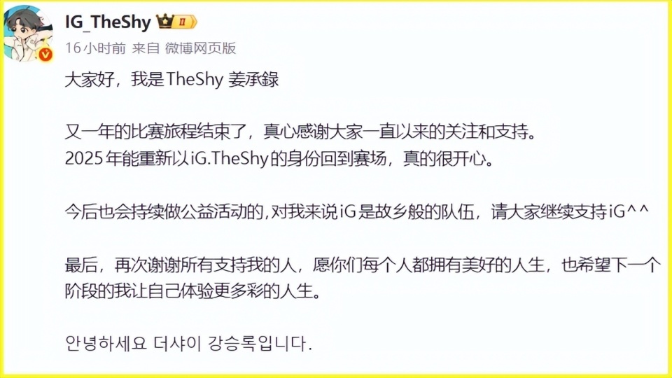 关注度最高的TheShy,这次并没有续约,IG发文宣布暂离赛场,TheShy本人的回应,也让他明年去向充满悬念,在文中TheShy表示:对我来说IG是故乡般的队伍,同时他也强调,希望自己下一个阶段,能体验更多彩的人生,没有续约,话里话外又暗示退役,这次可能是真离开赛场了。