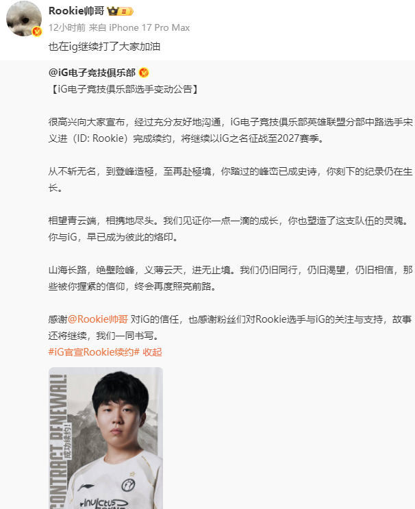 IG宣布和rookie成功续约,合同2027年到期,要在IG打到30岁