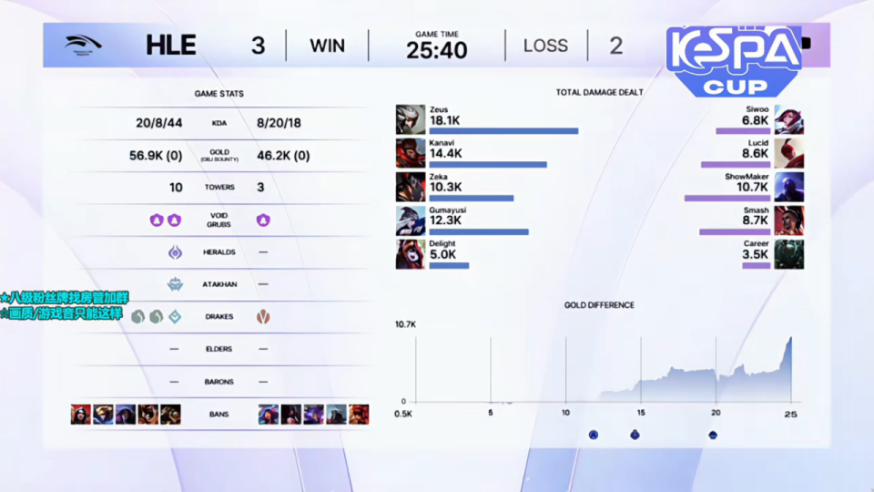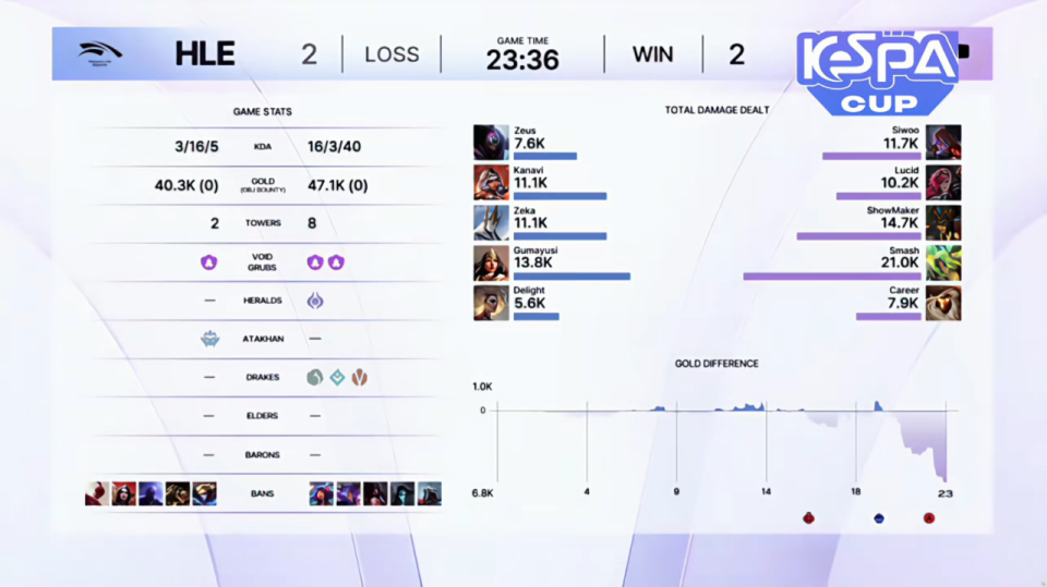 结果决胜局的比赛,变成了HLE的表演赛。比赛前期,HLE取得明显优势,比赛第16分钟左右,HLE取得4000的经济领先;比赛第23分钟左右,两队爆发激战,HLE打出3换3后进一步扩大优势;最终比赛第25分40秒,HLE一波打出0换5后结束比赛。