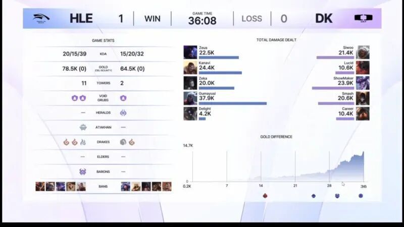 结果这一局比赛,HLE在前期就利用优势,打出了4000的经济领先。比赛第30分钟左右,HLE大龙逼团先后一波打出1换4并拿下大龙;比赛第32分钟左右,DK抓到HLE上野将其击杀,但HLE迅速稳住局面;最终比赛第36分08秒,ShowMaker辛德拉埋伏失败被Zeka发条单杀,HLE击杀DK双C后迅速一波。