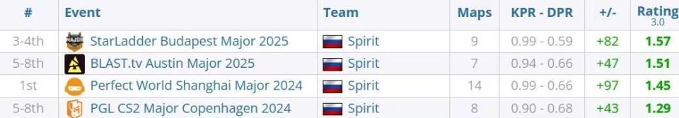 而无缘决赛的donk保持着9图1.57 rating的目前本届赛事最高数据,并且据HLTV数据页面显示,布达佩斯Major是donk职业生涯中表现最佳的一届Major赛事。