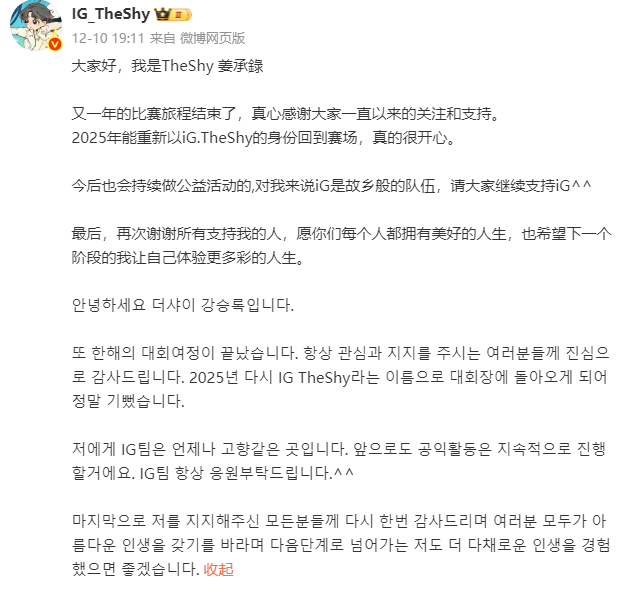 TheShy随后发布的告别动态,语气平静,没有遗憾,也没有不甘,他说,能够在S15以IG上单的身份重回赛场,已经很开心,希望下一阶段的人生同样精彩,对老粉丝来说,这样的表达反而比直接说“退役”更让人难受,因为这几乎等同于一种温和而坚定的告别——不是暂别舞台,而是主动转身。