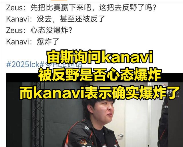 近期kanavi与HLE上单宙斯的对话,再度印证TES粉丝们的猜测。HLE上单宙斯向打野kanavi发问,“在比赛中被对手反野后,心态是否崩溃”,而kanavi回应,自己被对手反野时,心态确实爆炸了。而kanavi的这种自暴短板的发言,确实让很多LOL观众不理解,认为kanavi这种选手太超雄,未来kanavi如果不发生改变,那么HLE很难拿到世界冠军。