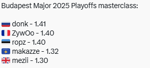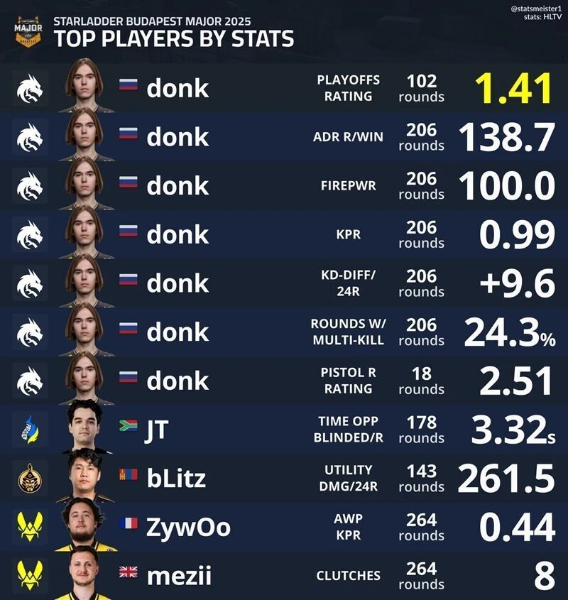 donk以1.41的rating略胜ZywOo位居榜首,ropz排名第三。NaVi的makazze排在第四位,mezii以1.30 rating跻身前五。